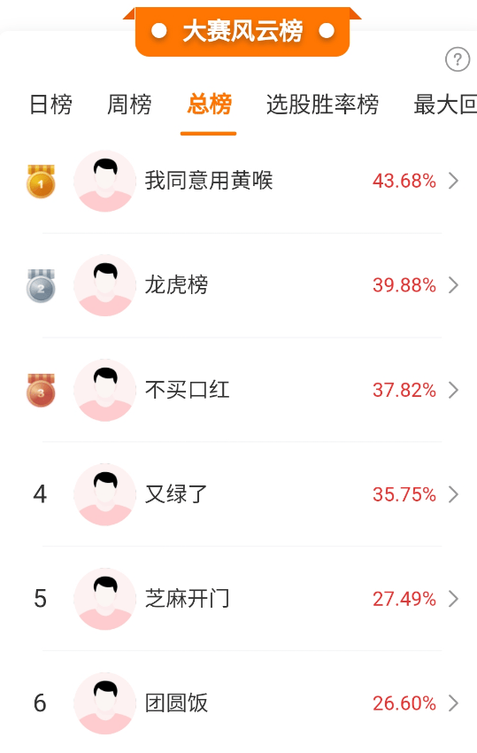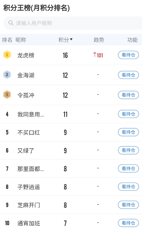从11月的月度积分王来看,选手“龙虎榜”以16分位居第一,选手“金海湖”以12分位居第二,选手“令狐冲”以12分位居第三。根据比赛规则,当月度总积分相同时,以当月最后一期比赛的收益率进行排名,前100名选手都将获得现金奖励。