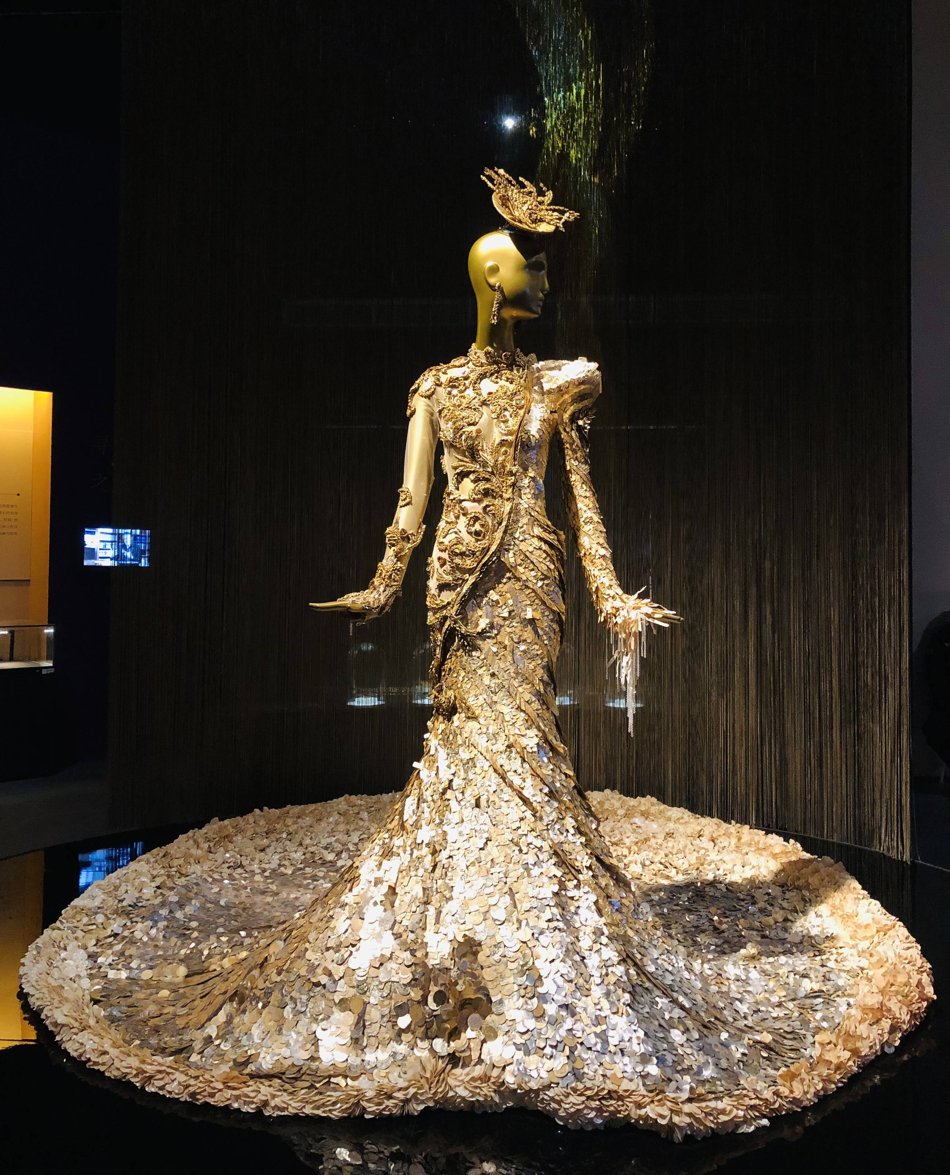 展厅中,著名设计师郭培《轮回》《极乐世界》《童梦奇缘》《一千零二夜》等高定系列中蜚声国际的代表作品熠熠生辉,从神话与传说中汲取灵感,将缂丝、刺绣等传统织金工艺与现代设计语言交织融合,为古老的鎏金故事续写新章。