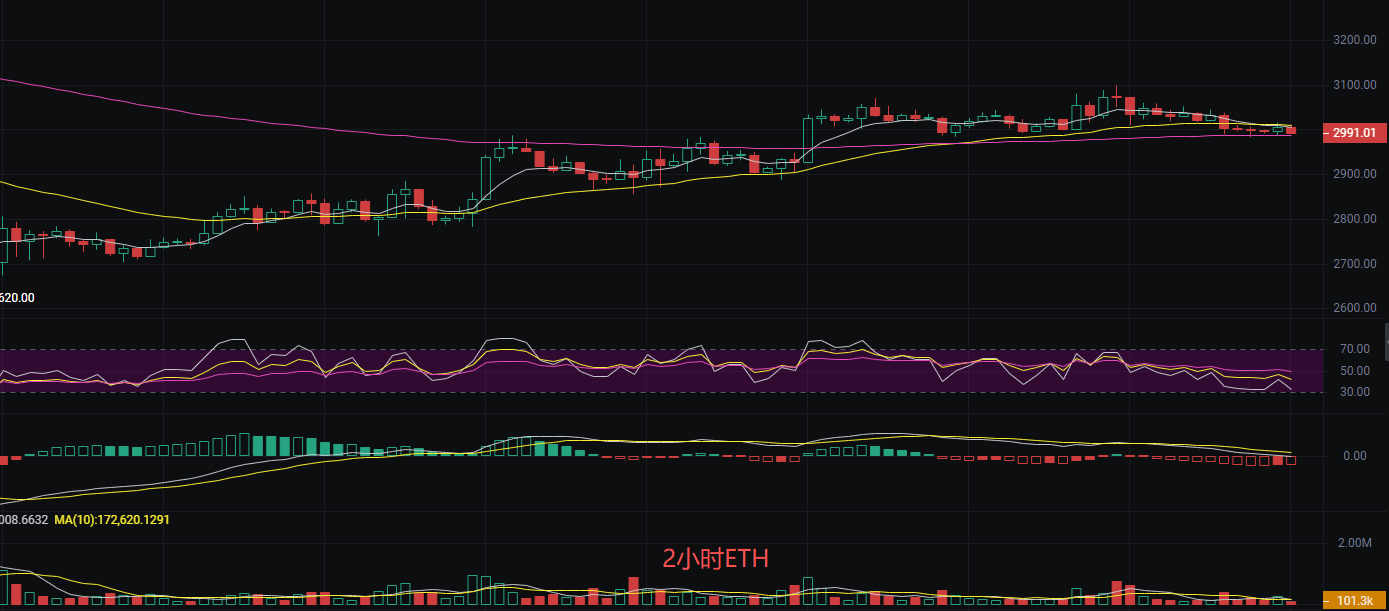 发稿前以太坊现价2990,丽盈观察目前盘口以太ETH在关键支撑位2620和阻力位3048之间波动。技术面显示,市场动能减弱,短期内价格位于均线系统之下,且近期出现的看跌吞没形态暗示可能存在下行风险。然而2620作为前期低点,具备较强支撑作用,短期内价格可能在支撑与阻力之间反复震荡。高点3099后回落至2995一带,形成明显的冲高回落走势。日K线连续阴线短期内呈现弱势调整,但整体仍处于前期上涨后的高位区间整理中。MACD2小时空头力量占优日线趋势偏弱。EMA短期阻力较强,支撑关注EMA120,短线思路丽盈偏向于盘整行情,虽说空头占比多一些,周末盘整概率加大