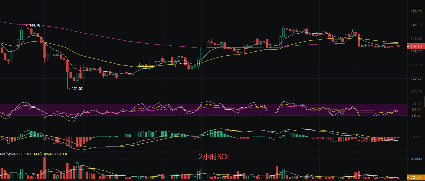 索拉拉目前价格为137.1,丽盈判断目前索拉纳当前SOL市场处于区间震荡格局,价格接近130.1的强支撑位,该位置为前期低点,具有较强的技术意义。同时,技术图形上出现了看涨吞没形态,暗示短期内可能出现反弹。但上行空间可能受限,需密切关注137.1的强阻力位表现。日线从高位143附近回落至137一带,形成连续阴线后小幅震荡整理,呈现弱势反弹格局,2小时K线上方压力较强,短期仍处于震荡偏空走势。MACD2小时动能依然偏弱。EMA2小时呈现空头排列,综合来看丽盈认为周末日内行情走震荡没有太大空间可以操作,建议观望
