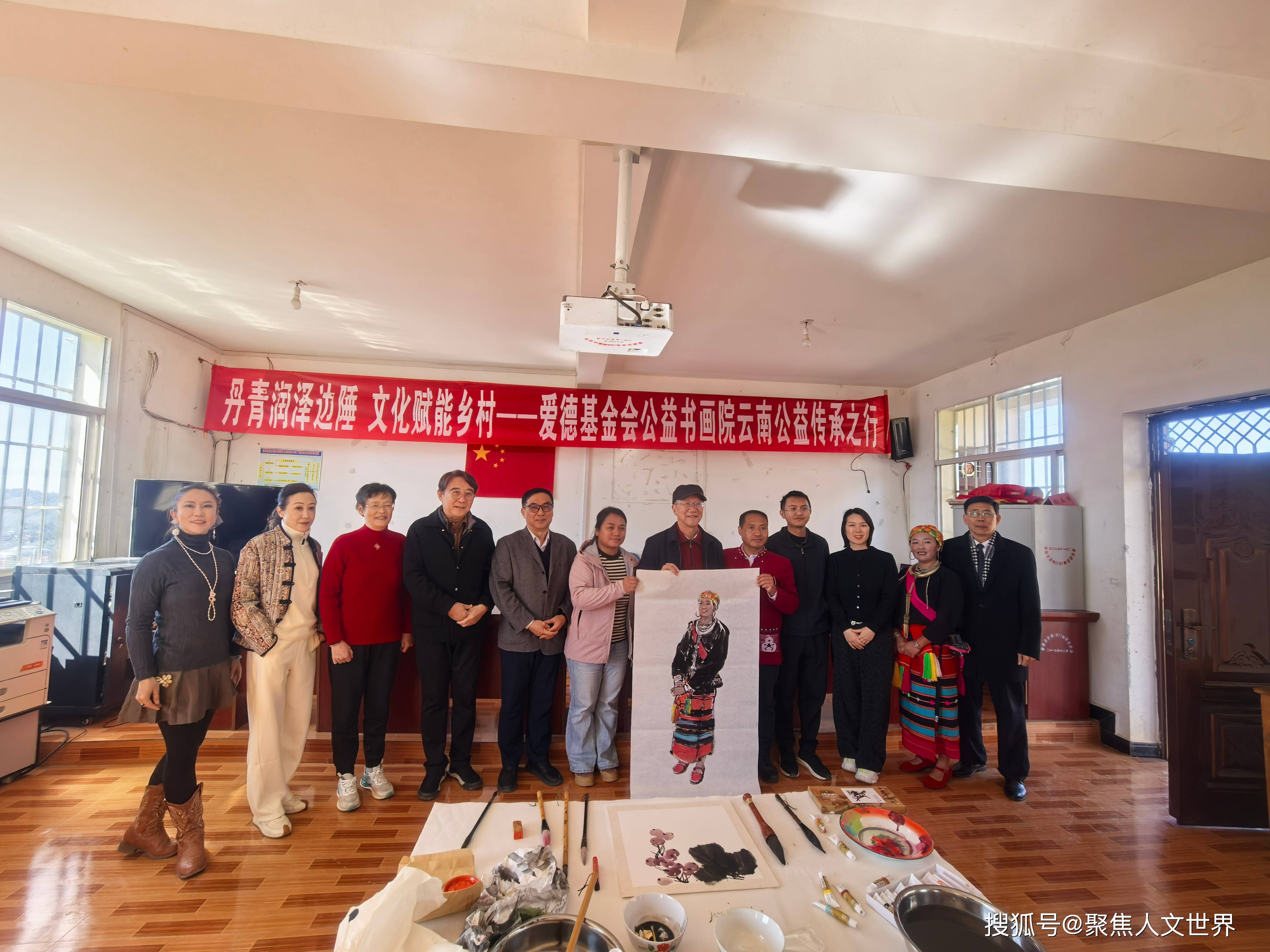01 走进边陲:艺术与乡村的相遇 沧源佤族自治县位于云南省临沧市西南部,地处祖国西南边陲,与缅甸接壤,是佤族文化的重要发源地之一。这里少数民族文化底蕴深厚,但专业书画艺术资源相对匮乏。 本次活动参与人员:沧源佤族自治县委统战部副部长、县工商联党组书记、常务副主席徐向辉,糯良乡人民政府宣传委员茶大一,糯良乡贺岭村委会书记田开兰,爱德基金会公益书画院常务院长、云南省美协第六届副主席孙建东,爱德基金会公益书画院常务院长、南京市文化和旅游局原二级巡视员尤荣喜,爱德基金会公益书画院常务院长、爱心企业家李阿康董事长、爱心人士姚晴主任,画家翟艳娜老师、尹蕾老师,朱婷婷老师等。 在活动启动仪式上,徐向辉副主席及李阿康董事长等分别致辞, 表达了对这次艺术赋能乡村活动的期待与支持。 艺术家孙建东、尤荣喜院长一致表示:“书画艺术是中华民族的瑰宝,承载着‘仁爱’、‘和谐’与‘奉献’的精神内涵”。这与佤族文化中崇尚自然、团结互助的传统价值观不谋而合,用手中的笔描绘美丽的沧源。茶大一、田开兰等交流发言。 戴德新讲话时说,此次公益之行,让我们尤为感动的是,爱心人士家李阿康董事长、姚晴主任,他们致富思源、富而思进,以实际行动回馈社会,关注沧源乡村文化建设,他们的善举,让我们看到了新时代企业家德行并重的担当。