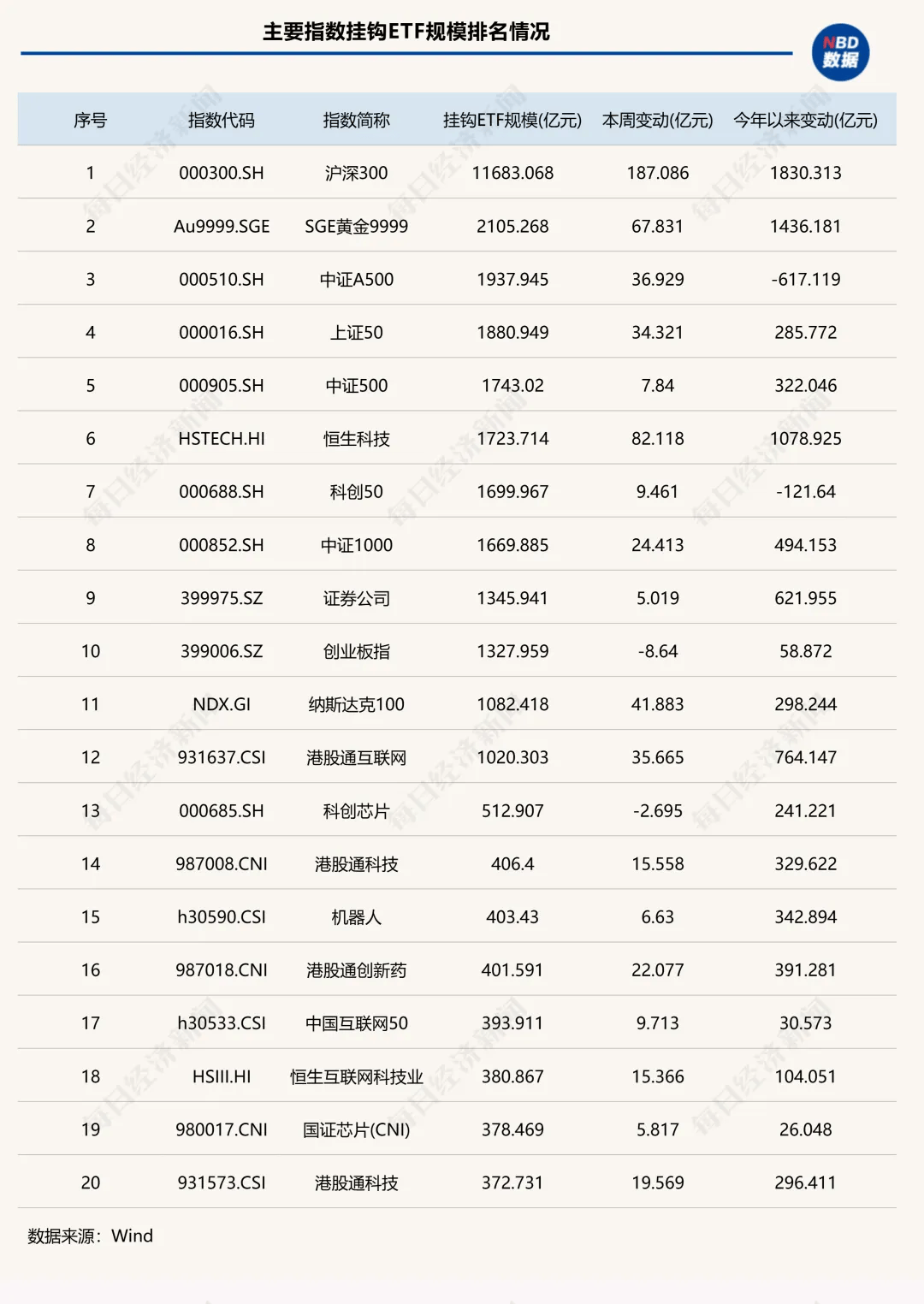 从挂钩指数来看,本周主要指数挂钩ETF规模普遍“回血”,规模前20名中仅2只指数挂钩ETF规模小幅缩水。