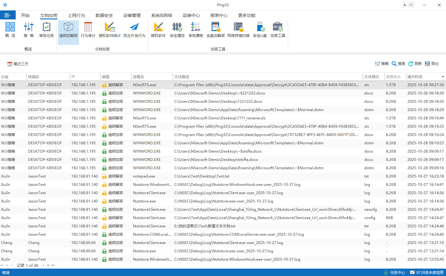代码透明加密:Ping32采用驱动层透明加密技术,对源代码文件进行实时自动加密。当开发人员在IDE中编写代码时,系统会自动对源代码文件进行加密处理,整个过程无需人工干预。加密后的代码在授权开发环境中可正常编译调试,一旦脱离授权环境则无法查看,有效防止源代码通过U盘、邮件等途径泄露。