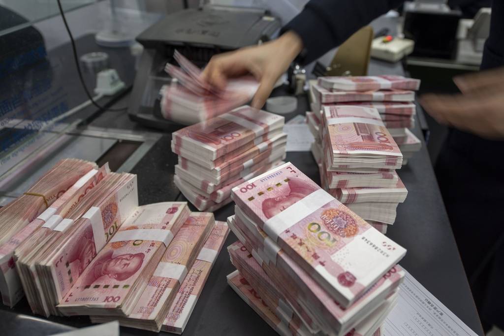 2021年2月1日,在江苏南通一家银行,银行人员在清点客户存入的人民币现钞。IC Photo