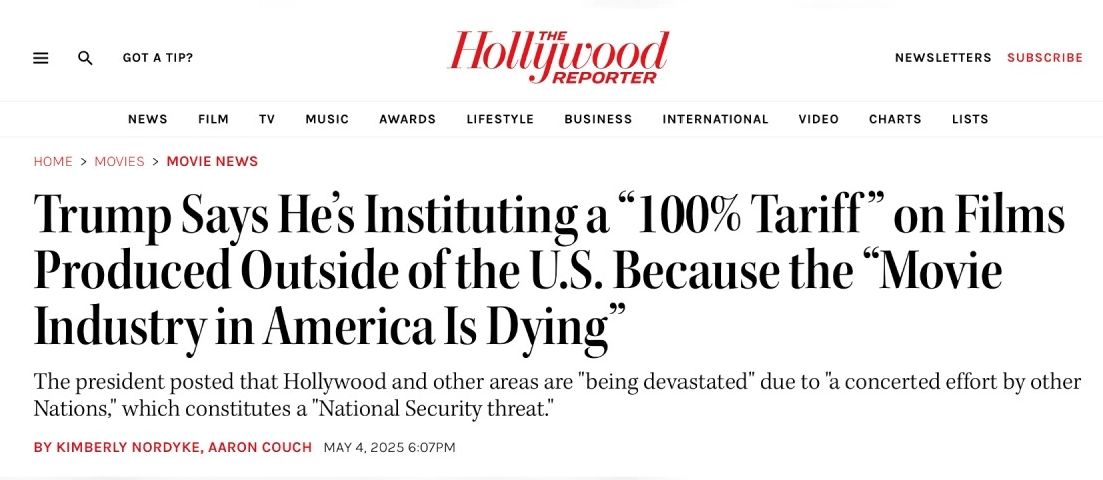 今年5月,美国总统已授权美国商务部和美国贸易代表立即启动程序,对所有在外国制作并进入美国的电影征收100%的关税。