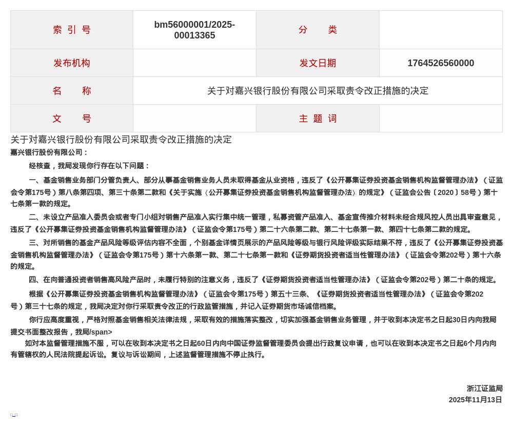 蓝鲸新闻12月1日讯,近日,浙江证监局发布行政监管措施决定书,剑指嘉兴银行股份有限公司。
