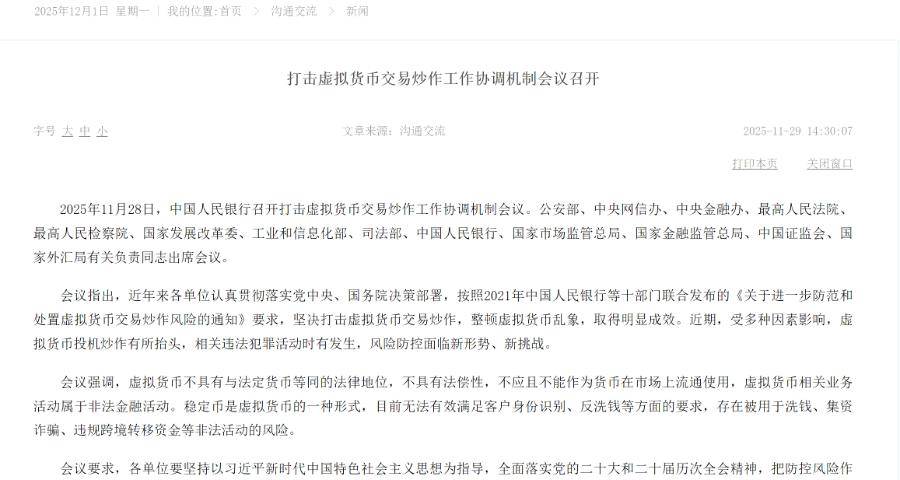 央行召开打击虚拟货币交易炒作工作协调机制会议,央行官网