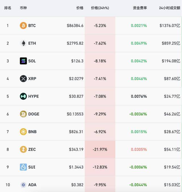 消息面上,加密货币亦遭遇猛烈抛售,比特币一度跌破8.4万美元,最低跌至8.38万美元,截至发稿,比特币大跌超5%,以太坊、XRP、HYPE大跌超7%,DOGE币暴跌超9%,ZEC币暴跌超21%。