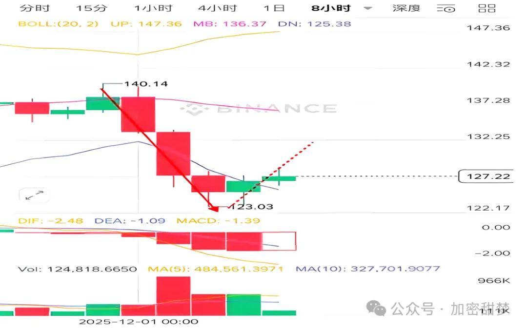SOL140-123是一个完整的波段,已经走完。如果重新再空,等反弹131.5-133.5再空比较合适。