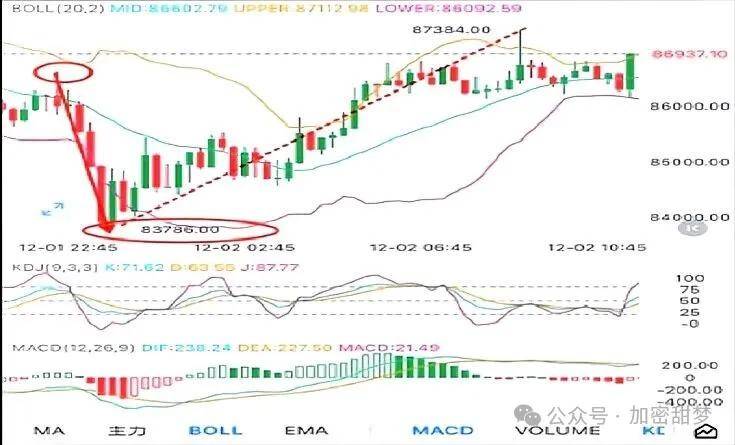 (2)今天反弹的高点:83786+3620 = 87,406(2小时boll中轨87390附近) 今天的压力在87450-87700。