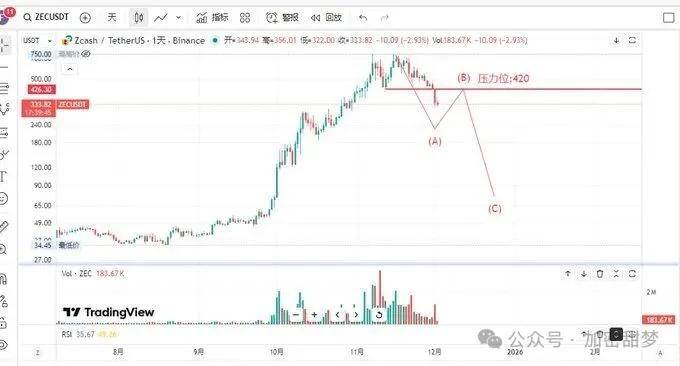 ZEC跌破11月12日低点424之后加速下跌,目前A浪还没有跌完,A浪目标位在200左右,A浪跌完后会有B浪反弹,B浪反弹目标位在图中压力位附近。 我之前空单平的太早了,只能在B浪反弹时再开空单了。