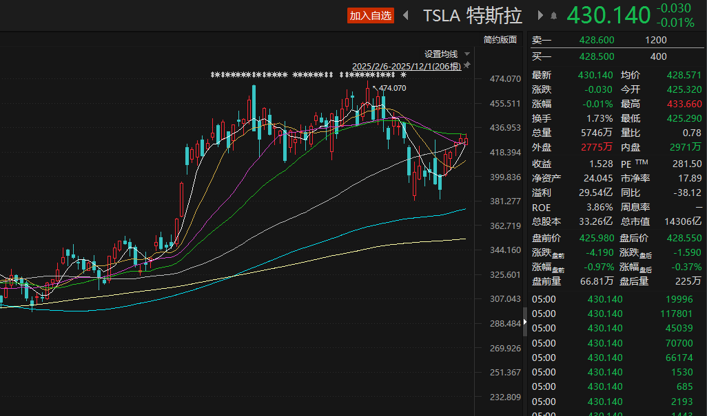 从股价表现来看,特斯拉在2021年一季度走出冲高回落的行情,先是在2021年1月上涨12.45%,又在随后的两个月下跌16%。不过,该股股价此后继续上涨。据统计,2021年4月1日至2025年12月1日期间,特斯拉股价累计涨幅为93.2%。
