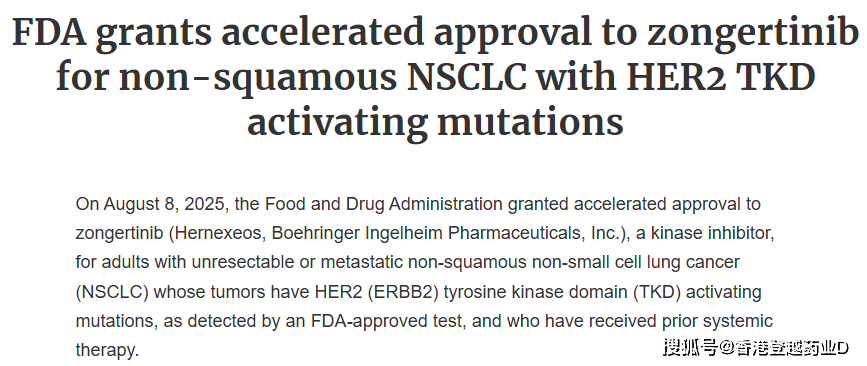 美国食品药品监督管理局 (FDA) 已加速批准 Hernexeos® ( zongertinib),用于治疗患有不可切除或转移性非鳞状非小细胞肺癌 (NSCLC) 的成年患者,这些患者的肿瘤具有人类表皮生长因子受体 2 (HER2/ERBB2) 酪氨酸激酶结构域激活突变(经 FDA 批准的检测检测),并且已接受过全身治疗。