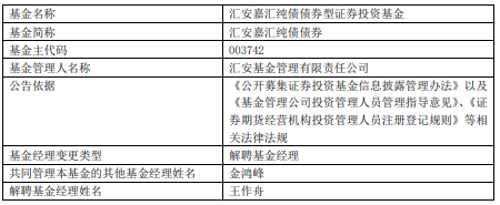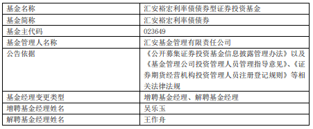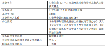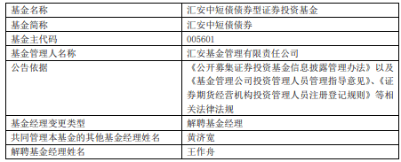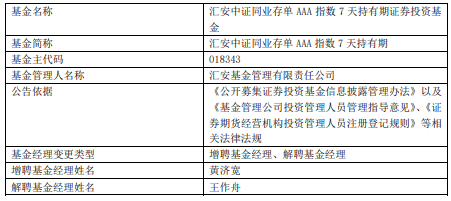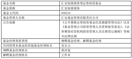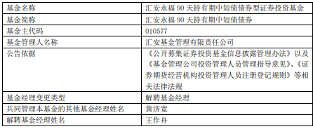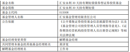 中国经济网北京12月2日讯 今日,汇安基金公告,王作舟离任汇安恒鑫12个月定开纯债债券、汇安裕宏利率债债券、汇安嘉汇纯债债券、汇安短债债券、汇安中证同业存单AAA指数7天持有期、汇安中短债债券、汇安永福90天持有期中短债债券、汇安永利30天持有期短债 。