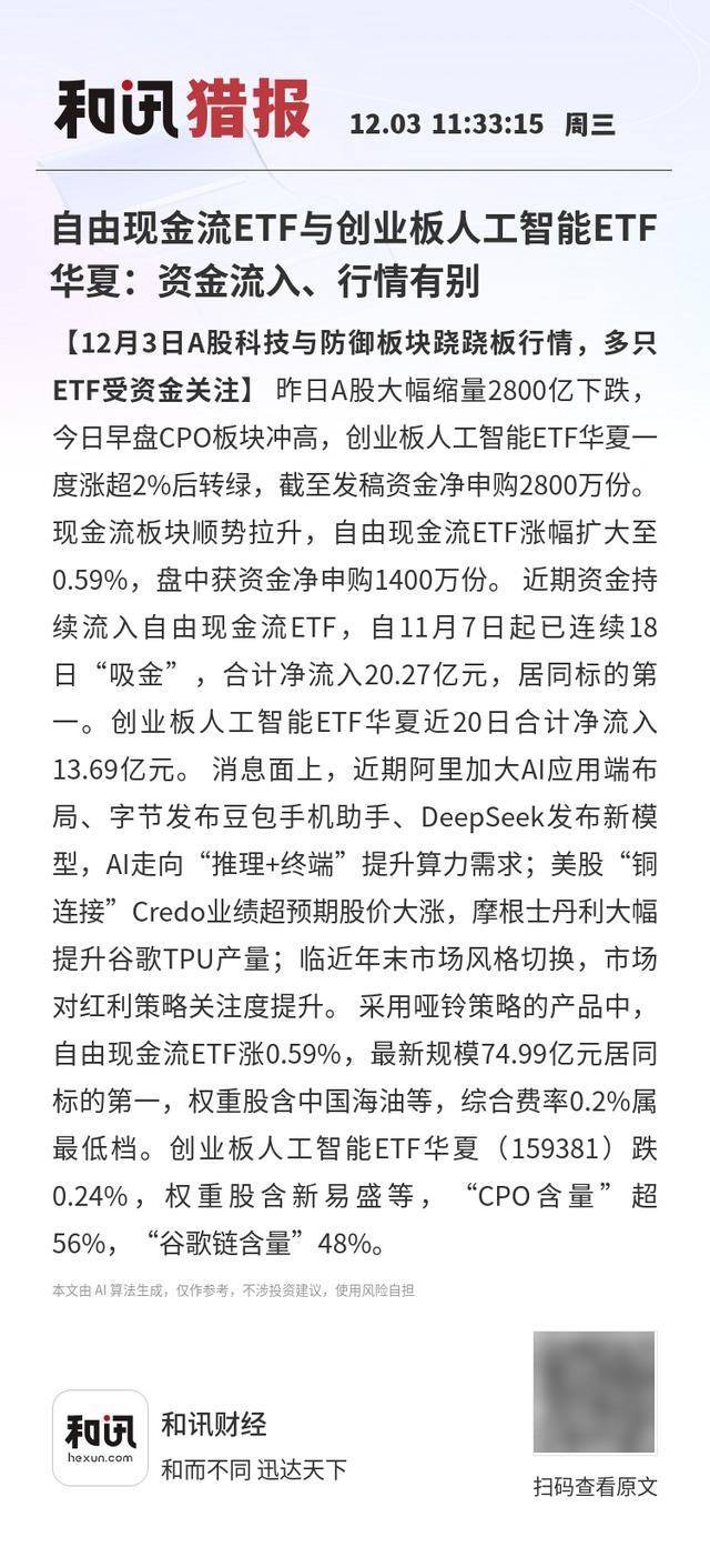 【12月3日A股科技与防御板块跷跷板行情,多只ETF受资金关注】昨日A股大幅缩量2800亿下跌,今日早盘CPO板块冲高,创业板人工智能ETF华夏一度涨超2%后转绿,截至发稿资金净申购2800万份。现金流板块顺势拉升,自由现金流ETF涨幅扩大至0.59%,盘中获资金净申购1400万份。近期资金持续流入自由现金流ETF,自11月7日起已连续18日“吸金”,合计净流入20.27亿元,居同标的第一。创业板人工智能ETF华夏近20日合计净流入13.69亿元。消息面上,近期阿里加大AI应用端布局、字节发布豆包手机助手、DeepSeek发布新模型,AI走向“推理+终端”提升算力需求;美股“铜连接”Credo业绩超预期股价大涨,摩根士丹利大幅提升谷歌TPU产量;临近年末市场风格切换,市场对红利策略关注度提升。采用哑铃策略的产品中,自由现金流ETF涨0.59%,最新规模74.99亿元居同标的第一,权重股含中国海油等,综合费率0.2%属最低档。创业板人工智能ETF华夏(159381)跌0.24%,权重股含新易盛等,“CPO含量”超56%,“谷歌链含量”48%。
