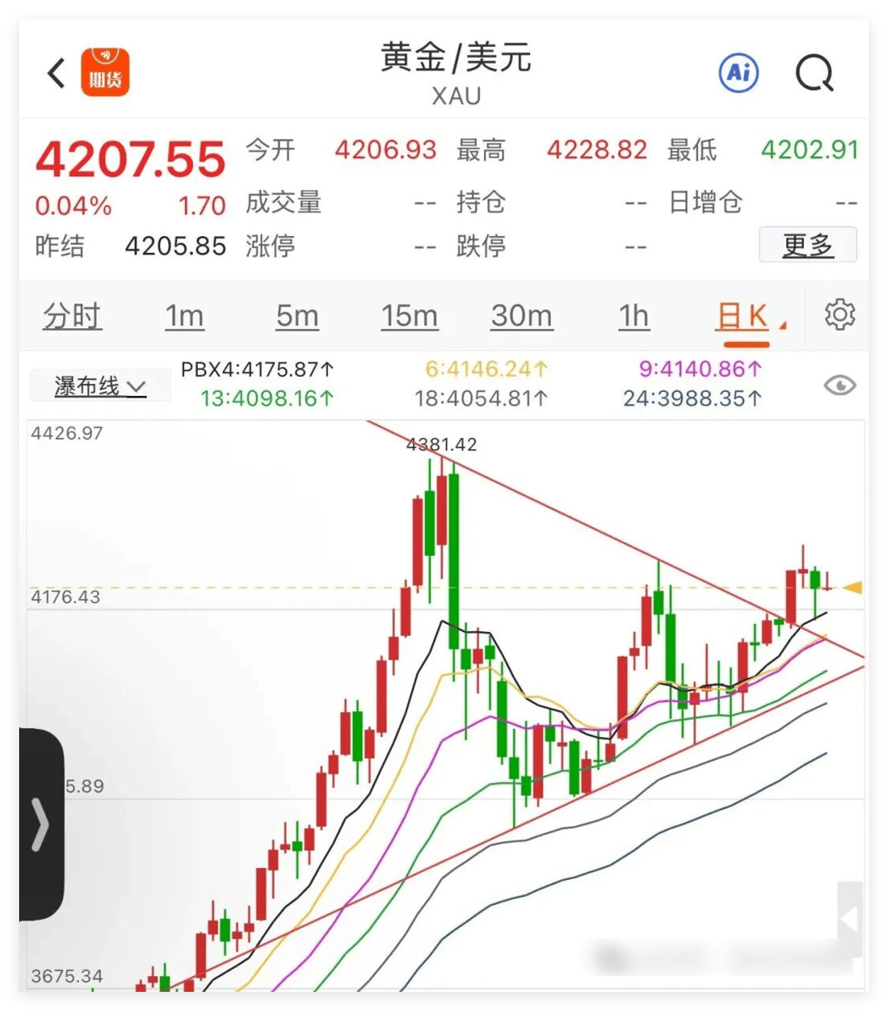 昨天我们说黄金要涨只能在4200之上,也就是5日线之上;一旦下了,就要走下跌了,市场呢它总是变幻莫测的,就跟彩票一样,虽然就那么几个数字,每次都差一点就完美了,但是就很难完美。