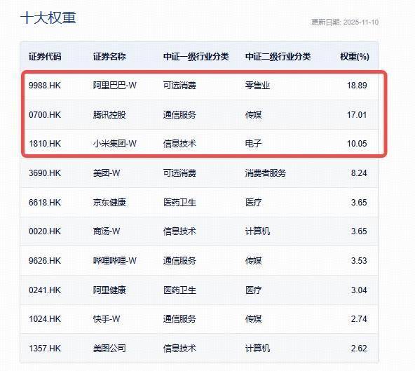 港股互联网ETF(513770)及其联接基金(A类017125;C类017126)被动跟踪中证港股通互联网指数,该指数重仓互联网龙头,阿里巴巴-W、腾讯控股、小米集团-W是其前3大权重股,权重占比分别为18.89%、17.01%、10.05%,前10大持仓汇聚AI云计算、大模型+各领域AI应用公司,合计占比超73%,龙头优势显著。