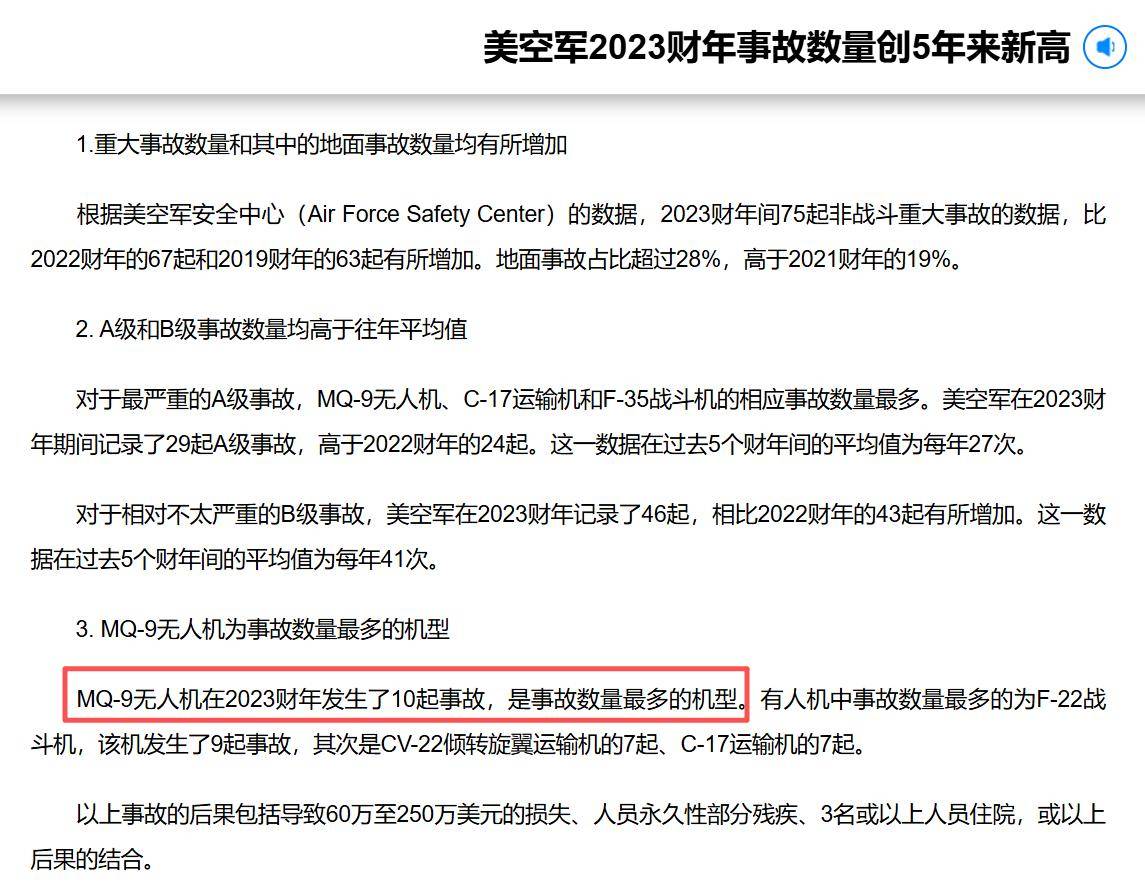 然而,问题并非首次发生。MQ-9的地面控制站并非第一次出现故障。美国国会研究服务处在2022年发布的报告中提到,MQ-9的A类事故率比其他军用飞行器高出约15%。迄今为止,MQ-9已经发生了62起A级事故,其中43架完全报废。对于一款单价高达3000万美元,且总产量仅几百架的无人机来说,这个数字堪称灾难。而此次事故的发生也并不让人感到意外。