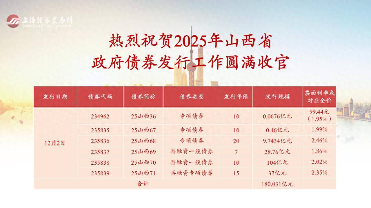 黄河新闻网讯(记者牛牧瑶)12月2日,山西省财政厅通过上海证券交易所成功发行今年第十一批政府债券180.03亿元,期限包含7年、10年期、15年、20年期,全场平均发行利率2.09%,平均投标倍数26倍。为持续改善债券流动性,在财政部指导下,本批开展了今年第二次续发行业务。