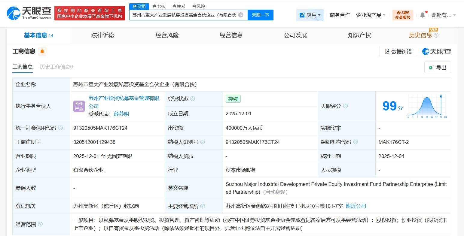 每经AI快讯,天眼查App显示,近日,苏州市重大产业发展私募投资基金合伙企业(有限合伙)成立,执行事务合伙人为苏州产业投资私募基金管理有限公司,出资额40亿元人民币,经营范围含以私募基金从事股权投资、投资管理、资产管理等活动,股权投资,创业投资,以自有资金从事投资活动。合伙人信息显示,该基金由苏州市产业投资咨询中心有限公司、苏州高新区国昇资本运营有限公司、苏州市能源产业投资有限公司等共同出资。