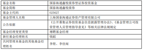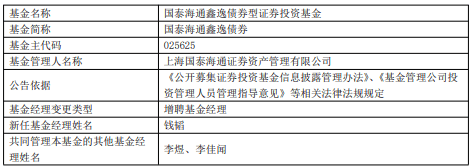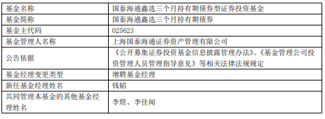 中国经济网北京12月3日讯 今日,国泰海通资管公告,国泰海通鑫逸债券、国泰海通鑫悦债券、国泰海通鑫选三个月持有期债券增聘钱韬。