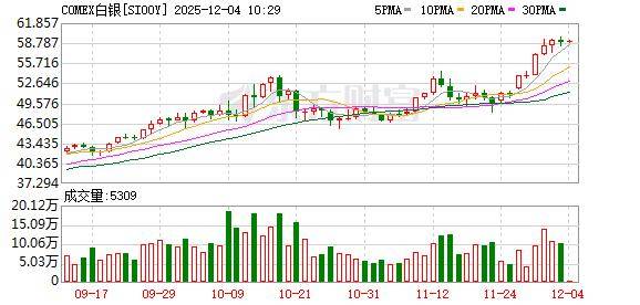 12月3日,伦敦现货黄金价格维持在4200美元/盎司上方强势震荡,较前一交易日小幅下跌0.6%,但整体仍保持在历史高位区域。国际白银价格再创历史新高:伦敦现货白银价格表现惊艳,盘中最高触及58.945美元/盎司,刷新历史纪录;纽约COMEX白银期货更是强势突破59美元/盎司大关,盘中最高触及59.655美元/盎司,创下历史新高。