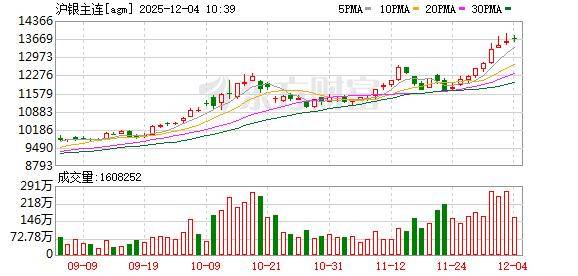 我国贵金属期货市场中,12月3日,上期所白银期货主力合约报收13582元/千克(13.58元/克),12月1日至3日累计涨幅为9%。当天上期所白银库存为476吨,处于相对低位。超过266万手的成交量和45.8万手的持仓量,表明当天市场交易非常活跃。同日,上金所白银T+D报价为13538元/千克(13.54元/克),三天涨幅超9%,价格也创出新高。