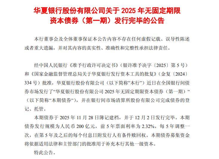 日前,华夏银行发布公告,近日在全国银行间债券市场成功发行了2025年无固定期限资本债券(第一期),发行规模为200亿元。
