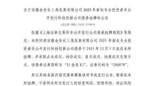 依据《上海证券交易所非公开发行公司债券挂牌规则》等规定,上交所同意安徽金安长三角发展有限公司2025年面向专业投资者非公开发行科技创新公司债券于2025年12月5日起在上交所挂牌,并采取点击成交、询价成交、竞买成交、协商成交交易方式。该债券证券简称为“25金发K1”,证券代码为“280878”。