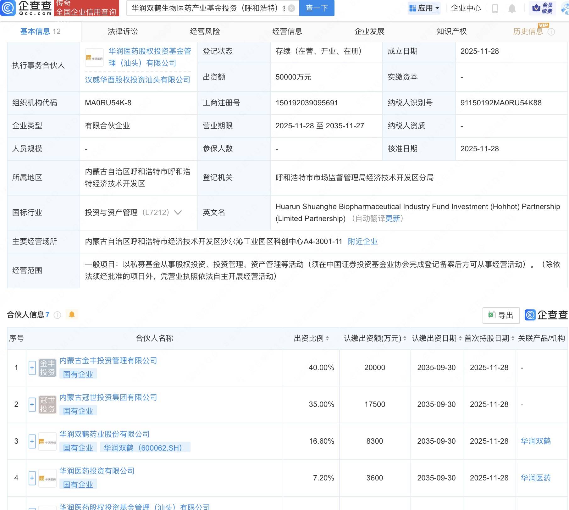企查查APP显示,近日,华润双鹤生物医药产业基金投资(呼和浩特)合伙企业(有限合伙)成立,出资额5亿人民币,经营范围包括以私募基金从事股权投资、投资管理、资产管理等活动。企查查股权穿透显示,该企业由华润双鹤(600062)、华润医药投资有限公司、华润医药股权投资基金管理(汕头)有限公司等共同出资。