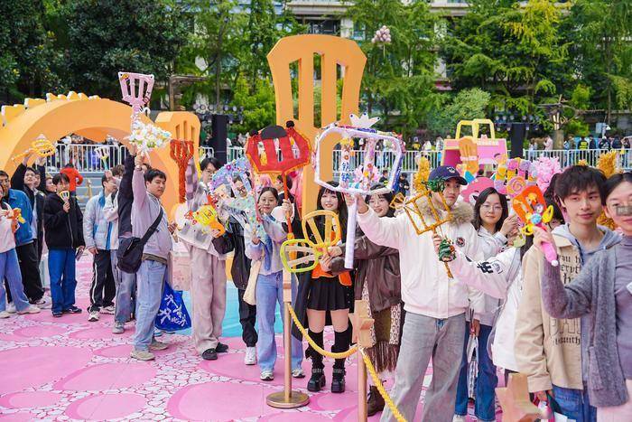 几秒钟前,他将那把打磨了两个通宵的“三星堆铲铲”,递进了胖胖龙好运乐园的活动摊位里。很快,一双毛茸茸的浅粉色胖胖龙爪伸出来,接走了他的作品。在小言身后,玩家们手里拿着各式各样的自制铲铲,用或好奇或期待的目光打量着他。成都11月中旬的温度宜人,在室外长时间逛着也不会不适。但越临近换铲窗口,现场气氛就越是紧张。