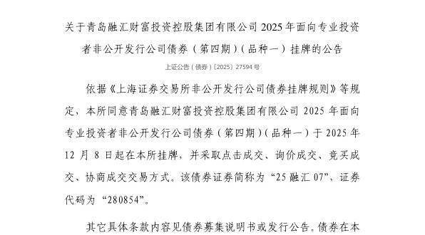 12月5日,上交所发布关于青岛融汇财富投资控股集团有限公司2025年面向专业投资者非公开发行公司债券(第四期)(品种一)挂牌的公告。