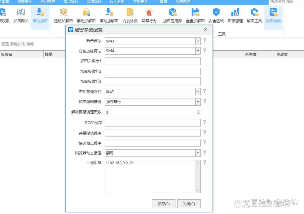 ��加密参数:文件加密后未经允许外发会自动明文转换为暗文,成为乱码格式,加密参数可设置乱码内容,自定义乱码格式内容,同时一定程度上起到震慑作用。