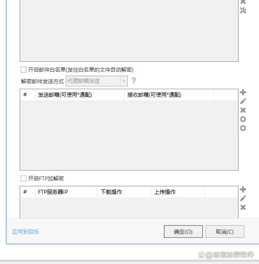 ��邮件白名单:针对由于邮件发送要求多的企业,此功能可针对于终端中存储大量加密软件时,针对某邮箱设置白名单,可单独放行此邮箱传输文件为不加密格式。