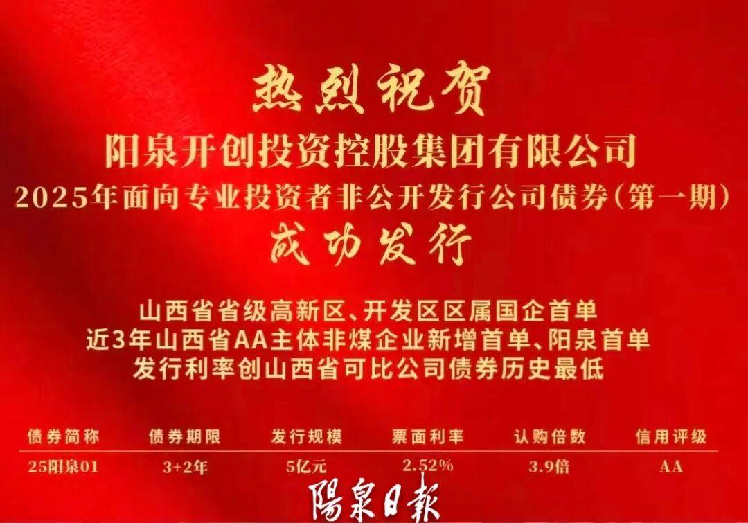 近日,阳泉高新区区直国有企业阳泉开创投资控股集团有限公司2025年面向专业投资者非公开发行的公司债券(第一期)在上海证券交易所成功发行。本期债券发行是高新区国有企业首次“亮相”资本市场,发行规模5亿元,期限3+2年,票面利率2.52%,认购倍数高达3.9倍,发行利率创全省可比公司债券历史新低。