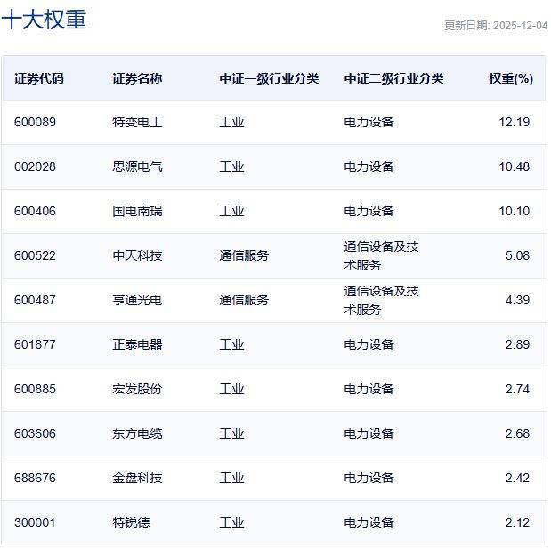 中证电网设备主题指数主要权重股