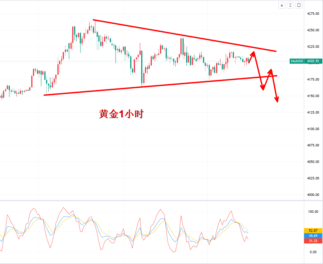 今天,我还是前两天的观点不变,高空为主,中途可以搭配反弹多,但也只是波段为主,4215-4220美元作为今天空的入场点,前面4240美元上方决定多空,向下4185-4180美元,跌破前面4170-75支撑还能向下延续一波,谨防黑色星期五。