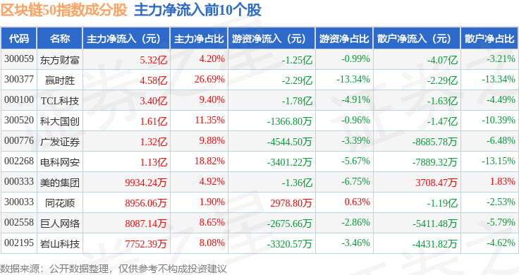 资金流向方面,区块链50(399286)指数成份股当日主力资金净流入合计17.19亿元,游资资金净流出合计9.52亿元,散户资金净流出合计7.67亿元。成份股资金流向详情见下表: