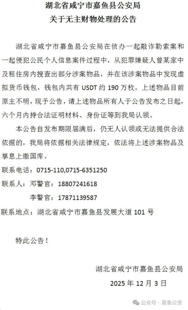 据嘉鱼公安,12月5日,嘉鱼公安发布公告,寻找一笔涉敲诈勒索案的虚拟货币原主人,虚拟货币钱包内共有USDT币约190万枚。根据最新的市场汇算数据,大约价值1356.6万元人民币。