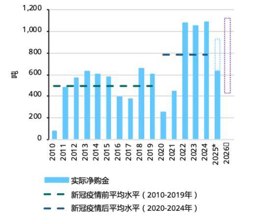*数据截至2025年三季度。蓝色虚线柱代表协会对2025年全年750至900吨央行购金量的预估。2026年紫色虚线柱表示一个宽幅预测区间,具体将取决于宏观与政策驱动因素。
