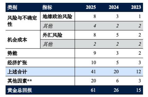 在上述两大要素中,地缘政治风险加剧与美元疲软的共同作用贡献了约16个百分点,凸显出特朗普第二任期以来政治与宏观经济不确定性对黄金表现的显著影响。