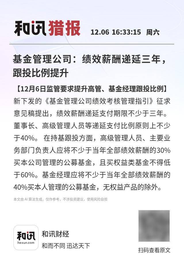 【12月6日监管要求提升高管、基金经理跟投比例】新下发的《基金管理公司绩效考核管理指引》征求意见稿提出,绩效薪酬递延支付期限不少于三年。董事长、高级管理人员等递延支付比例原则上不少于40%。在持基跟投方面,高级管理人员、主要业务部门负责人应将不少于当年全部绩效薪酬的30%买本公司管理的公募基金,且买权益类基金不得低于60%。基金经理应将不少于当年全部绩效薪酬的40%买本人管理的公募基金,无权益产品的除外。
