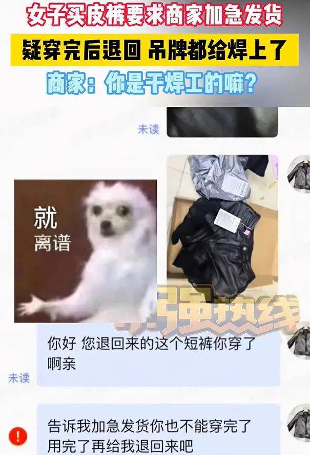 店家表示:(顾客)要加急发货,但穿完后再给我退了回来。吊牌剪后再焊接回去“焊接的老好了”。