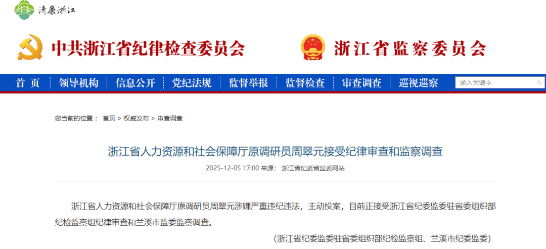 浙江省人力资源和社会保障厅原调研员周翠元涉嫌严重违纪违法,主动投案,目前正接受浙江省纪委监委驻省委组织部纪检监察组纪律审查和兰溪市监委监察调查。