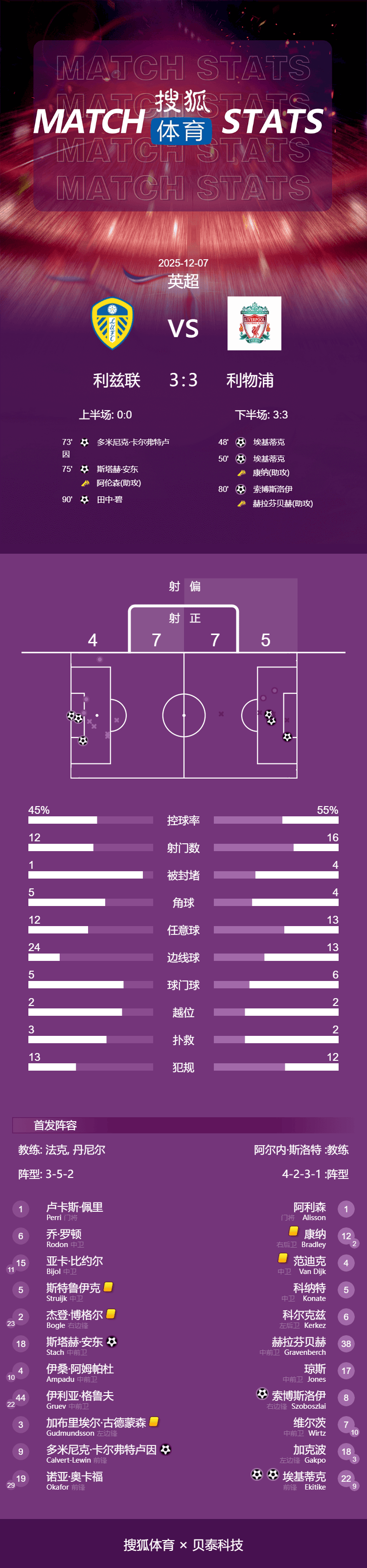 北京时间12月7日凌晨01时30分,2025-26赛季英超联赛第15轮继续进行,卫冕冠军利物浦做客埃兰路球场3-3憾平利兹联,遭遇两连平。埃基蒂克第48分钟和第50分钟连入助利物浦2-0领先,勒温和施塔赫先后进球扳平比分。索博斯洛伊第80分钟再次帮助利物浦超出比分,田中碧第96分钟帮助利兹联实现绝平。