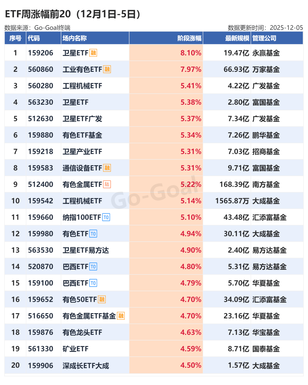 Go-Goal ETF数据显示,本周,商业航天概念爆火,卫星ETF涨幅居首。此外,工业有色、工程机械等相关ETF涨幅较前。