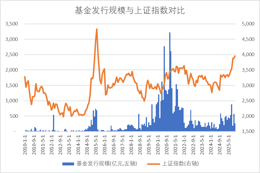 如果把全部主动型基金的单月发行规模和上证指数放到一张图中对比。其实很明显可以看出,当市场上涨时,往往基金的发行规模也开始增长,大家争先恐后的买入基金。这个也可以理解,毕竟市场上涨后,因为基金过去一段时间的历史表现较好,所以相对比较好卖。