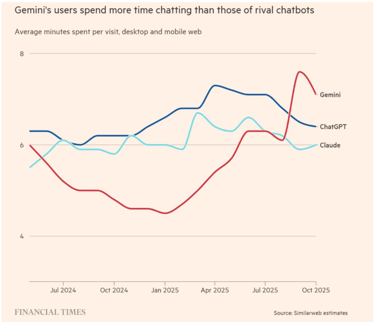 1、海外AI叙事持续发酵。近期谷歌全栈AI生态加速了产业链进展,谷歌TPU的出货量预期持续上调。Similar Web数据显示,截至2025年10月底,谷歌Gemini在桌面和移动端的单次平均使用时长飙升至7.2分钟,首次超越了ChatGPT(约6分钟)。为了应对来自谷歌的挑战,OpenAI拉响了红色警报,据称“内部评测超过Gemini 3 Pro”的GPT-5.2有望于12月9日发布。