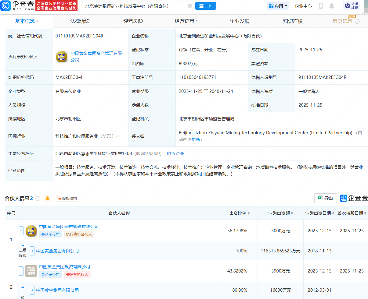 企查查APP显示,近日,北京金洲致远矿业科技发展中心(有限合伙)成立,出资额8900万元,经营范围包含:企业管理;企业管理咨询;地质勘查技术服务等。企查查股权穿透显示,该企业由中国黄金集团有限公司旗下中国黄金集团资产管理有限公司、中国黄金集团投资有限公司共同持股。