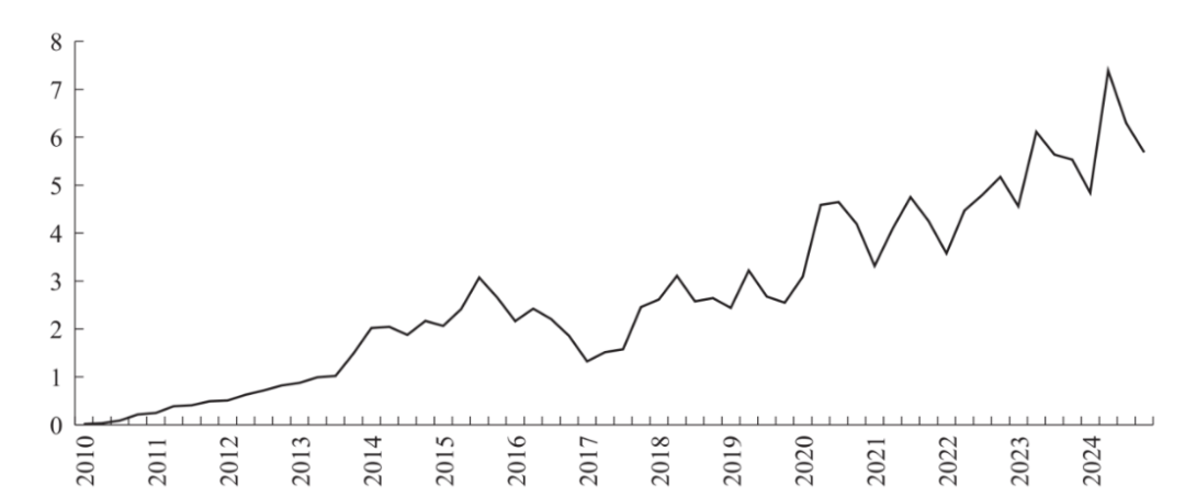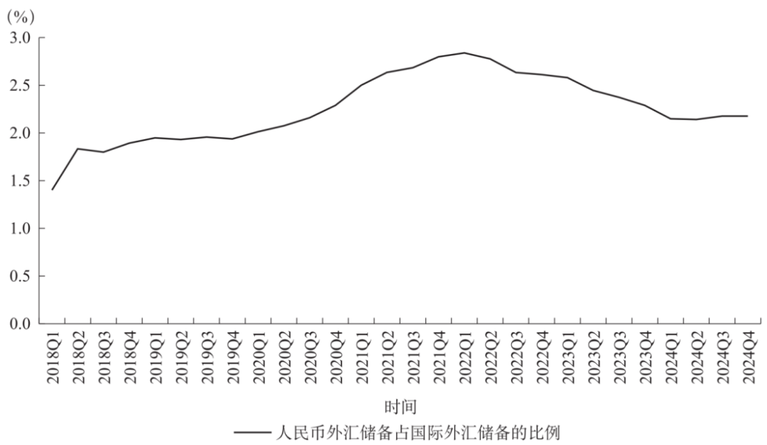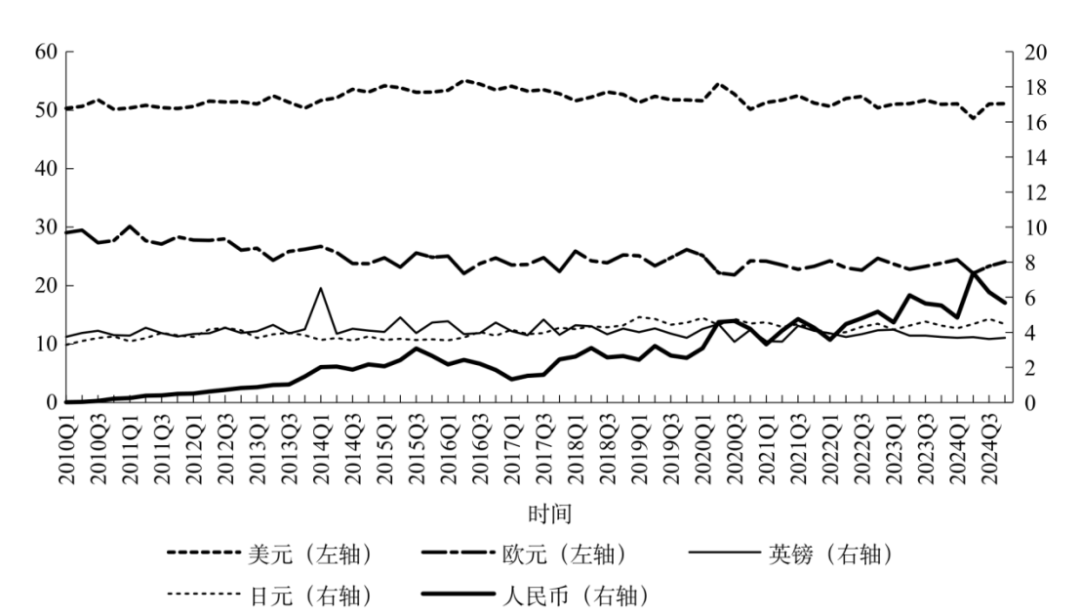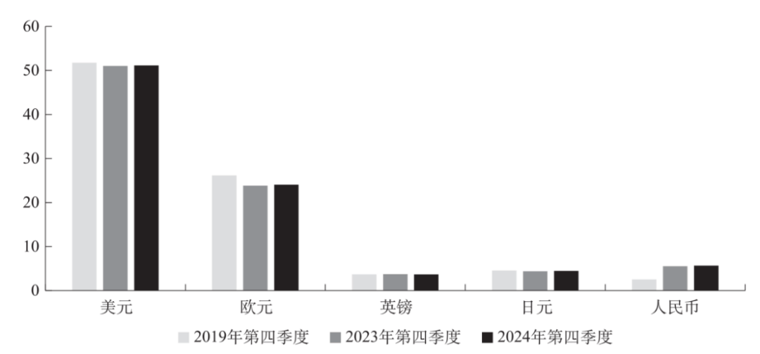 2024年,在地缘政治冲突持续升级、美元流动性波动加剧的背景下,人民币在全球外汇储备中的地位相对平稳(如图3所示)。俄罗斯在金融领域 “去美元化”的举措也将进一步提升人民币的国际化程度。2024年6月,俄罗斯中央银行宣布人民币将成为俄罗斯的主要外币,人民币/卢布汇率将为其他外币汇率的设定轨迹。2024年5月,沙特阿拉伯正式接受人民币作为石油贸易的结算货币,同时提出 “将人民币纳入沙特阿拉伯的官方外汇储备中”。拉美地区的人民币使用范围逐渐扩大,非洲及中亚国家也在不断跟进。2024年6月。当美国与沙特阿拉伯的 “石油美元协议”50年到期后,沙特阿拉伯宣布不再续签。这份始于1974年的协议,曾让美元与石油深度绑定,奠定了美元霸权的基石。从目前来看,沙特阿拉伯支持人民币结算或成大势所趋,同时双边贸易额不断攀升,中国已是沙特阿拉伯的最大贸易伙伴国。在中国与海合会国家的高层会晤中,双方已明确提出未来3~5年达成人民结算石油的目标。上述趋势表明,在美元信用受地缘政治冲击、欧元区经济疲软的背景下,人民币凭借中国稳定的经济基本面和不断开放的金融市场,正逐步成为国际货币体系的重要稳定器。